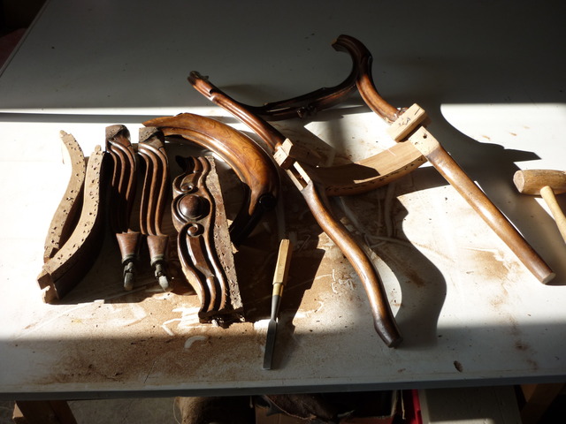 La remise en état de la carcasse : selon l'état du siège, le tapissier doit souvent procéder à des collages pour renforcer la carcasse. Il peut également faire appel à un ébéniste-restaurateur (ou un menuisier en siège) pour la remise en état du meuble. C'est également le meilleur moment de procéder au vernissage de la pièce, appliquer à la patine ou rattraper des teintes.- Le sanglage : consiste à la mise en place des sangles pour les entrelacer afin de donner un aspect de damier.