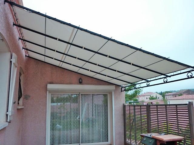 Confection sur-mesure d'une toile de pergola pour une utilisation permanente, fixe et non-démontable, en polyester PVC pour une étanchéité et une résistance exceptionnelles dans une gamme de coloris classique.